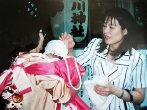 念願かなって退院できたのは翌年の4月1日、娘が生後3か月のときでした。雪の季節から桜の季節になっていました。遅くなってしまったけれど、生後4ヶ月を過ぎた頃に、夫と夫の母も一緒に、お宮参りをしました。